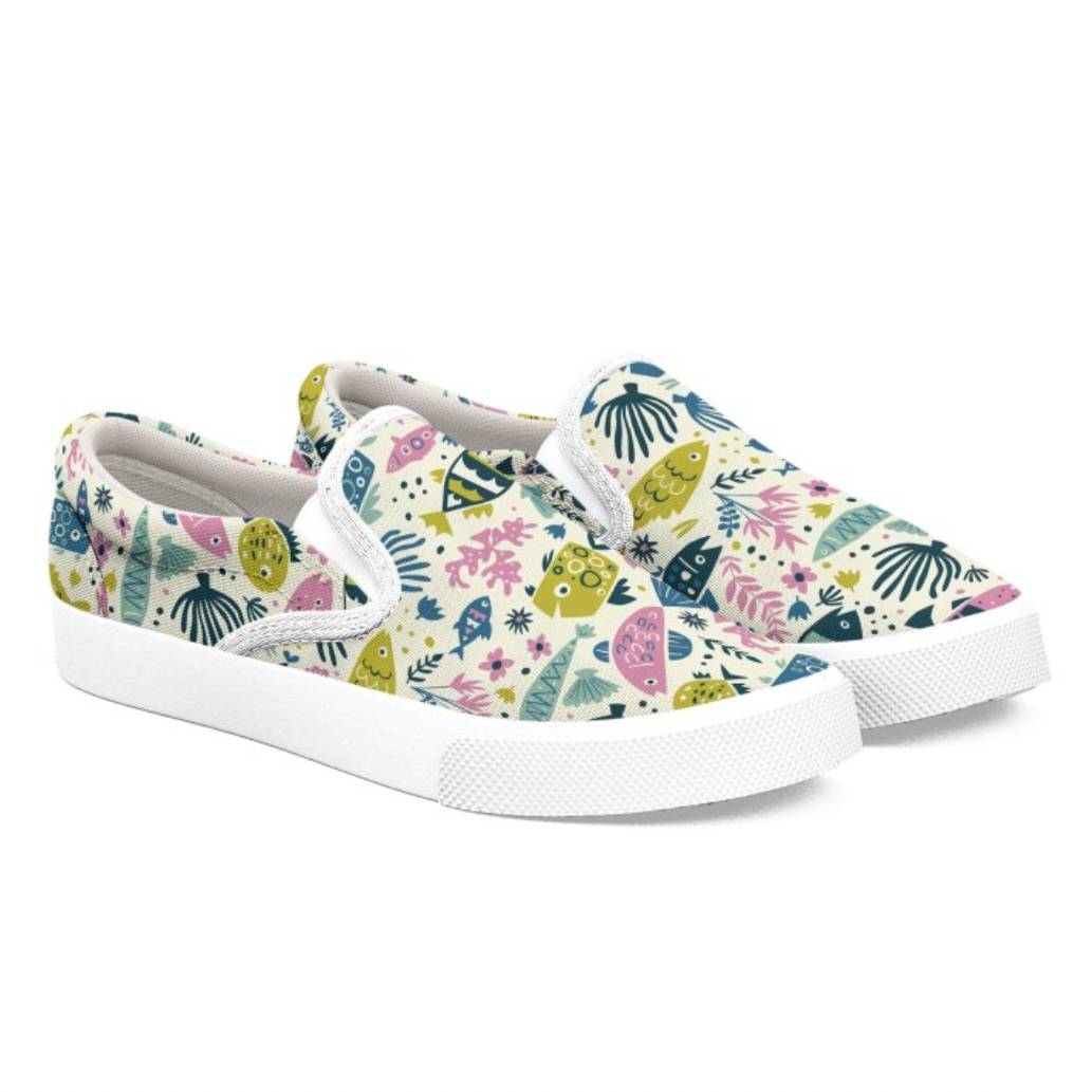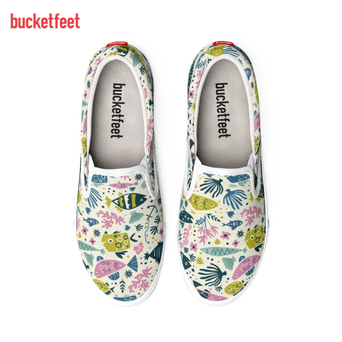 Colourful retro style fish pattern on bucketfeet classic slip shoes from