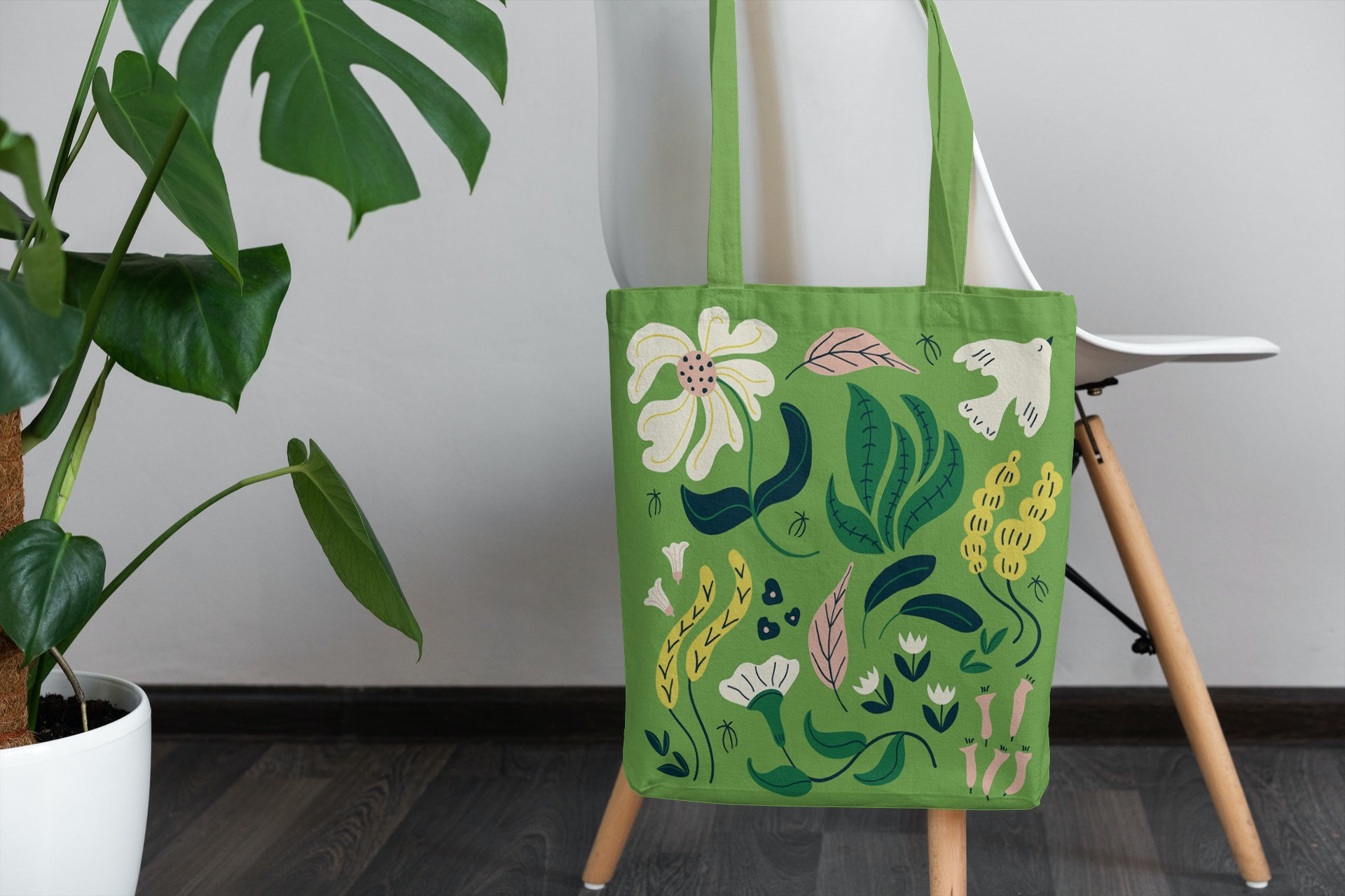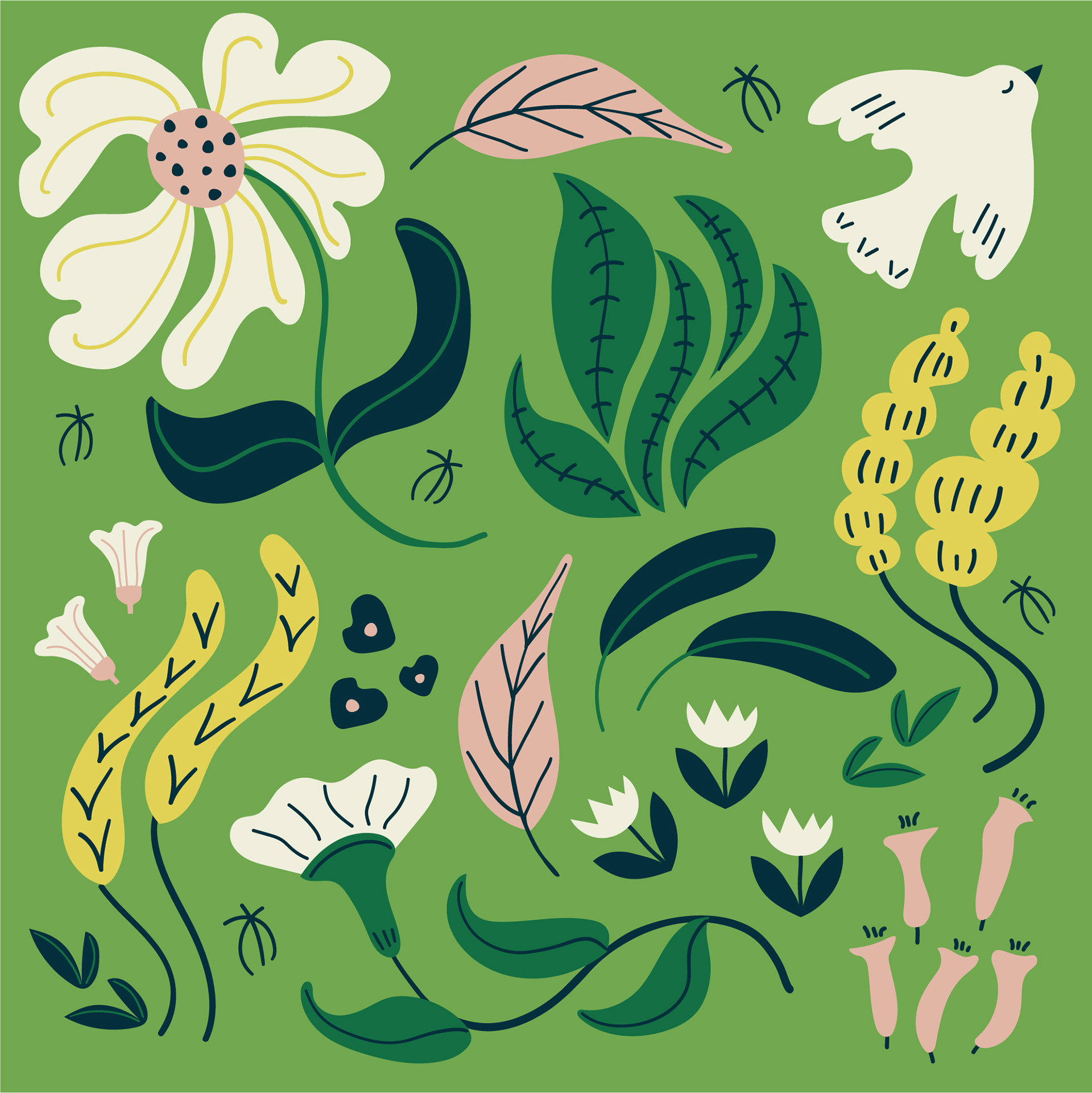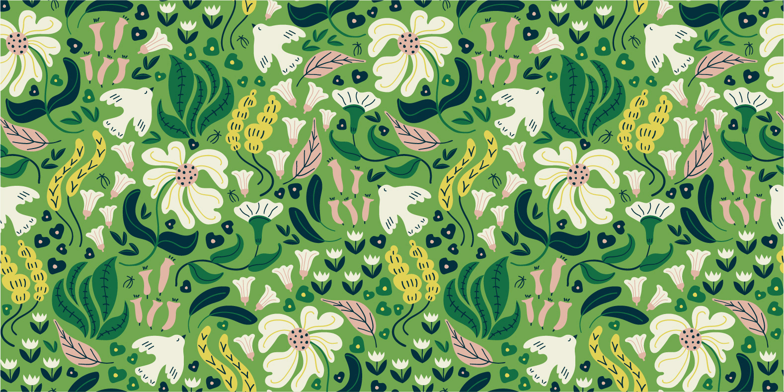 A collection of floral print & patterns using a fresh summery palette of soft peach, greens and lemon. Each design is versatile and works well on various product mockups.